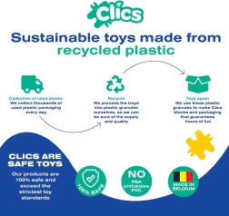 A CLICS építőkészlet egyszerű, összepattintható rendszerével gyorsan építhetők stabil modellek. A nagy, színes elemek jól kézbe illenek és önálló játékra inspirálnak. Egyetlen csomagból repülőt, vagonokkal ellátott mozdonyt, tűzoltóautót, hajót vagy aranyos állatkákat építhetsz – majd szétszedheted, és teljesen újat alkothatsz.