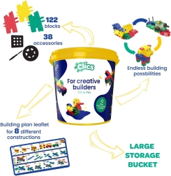 Színes és tartós elemek, matricák és útmutató masszív vödörben. Könnyű hordozás és tárolás, elveszett darabok nélkül.