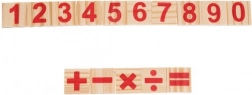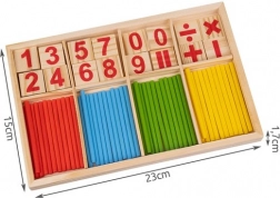 - 48 számolópálcika; 19 kocka számjegyekkel; 5 kocka matematikai jelekkel; fa rekesz