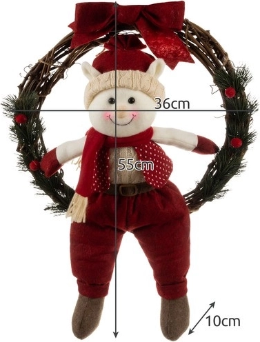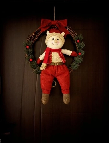 A piros ruhás, sállal ellátott, bájos textil manó játékosságot és otthonos melegséget kölcsönöz a koszorúnak. Tökéletes a családi karácsonyi díszítéshez.