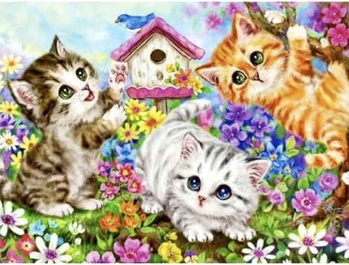 Alkossa meg a három kiscicát ábrázoló, virágzó kert témájú vidám képet. A kész vászon feldobja a gyerekszobát, a nappalit vagy a dolgozószobát.