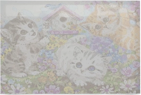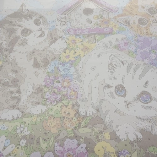 A vásznon lévő számozott mezők megfelelnek a festékes tégelyek számainak. A különböző méretű ecsetek segítenek a virágok és kiscicák finom részleteinek kidolgozásában is.