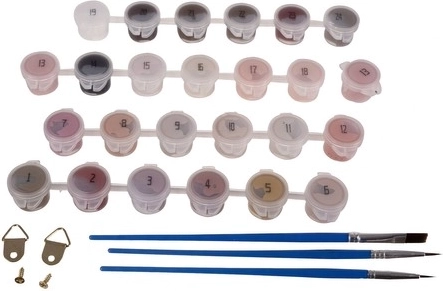 Minden szükséges eszközt megtalál a csomagban: fa keretre feszített vászon, akrilfesték-készlet, 3 ecset és akasztók a falra helyezéshez. Befejezés után egyszerűen felakaszthatja a képet, és újra átélheti az alkotás örömét.