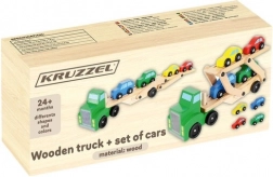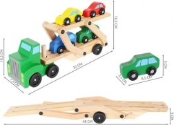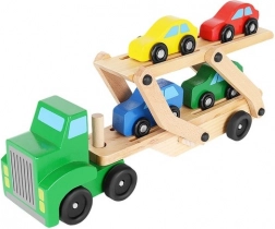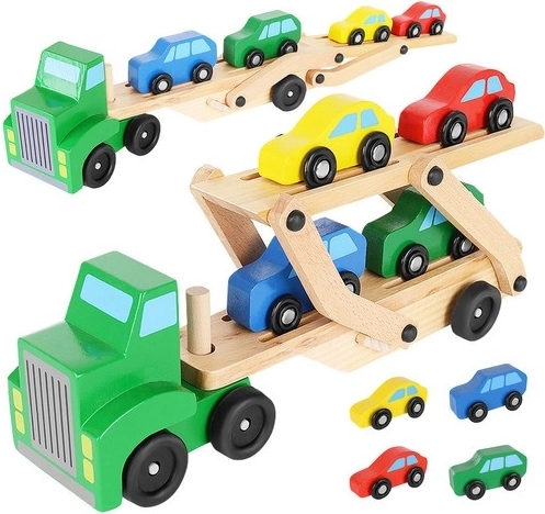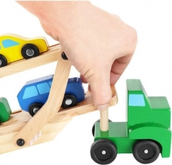 A fa teherautó utánfutóval és kisautókkal olyan játék, amely minden kis autórajongónak tetszeni fog. Ennek a játéknak köszönhetően a kicsi egy autókkal és teherautókkal teli világba csöppenhet, és hosszú órákon át önfeledten szórakozhat. Az autószállító olyan jármű, amely egyetlen kisautó-gyűjteményből sem hiányozhat. Ezzel gyermeke szabadon szállíthatja a járműveket szobáról szobára, és igazi kamionsofőrnek érezheti magát.