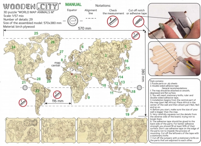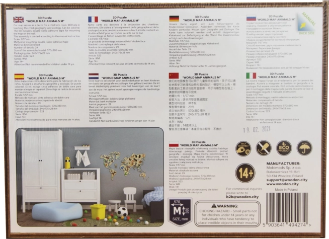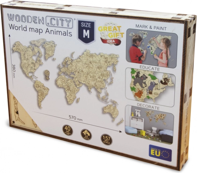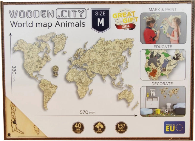 Fedezd fel a világot játékos formában. Az állatokkal díszített, 1:57 milliós léptékű fa térkép lézerrel precízen kivágott nyír rétegelt lemezből készül, így letisztult vonalakkal és természetes faerezetével tűnik ki. Remek dekoráció és tanulási segédeszköz is egyben – a gyerekek játékosan bővítik ismereteiket a kontinensekről, óceánokról és állatokról.