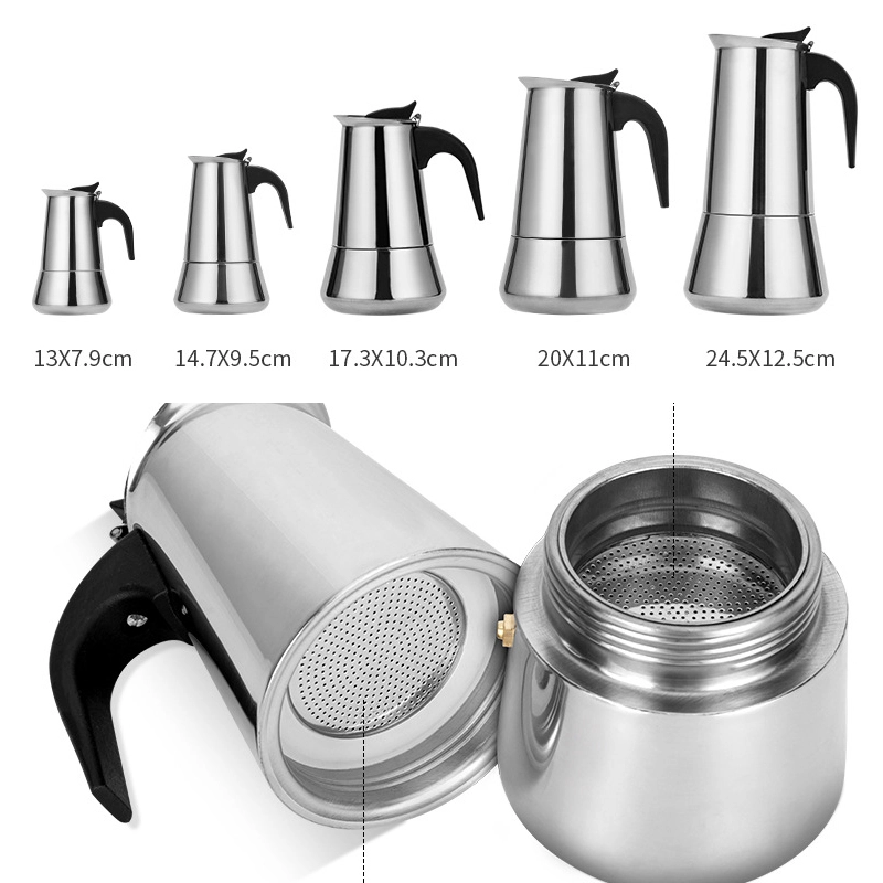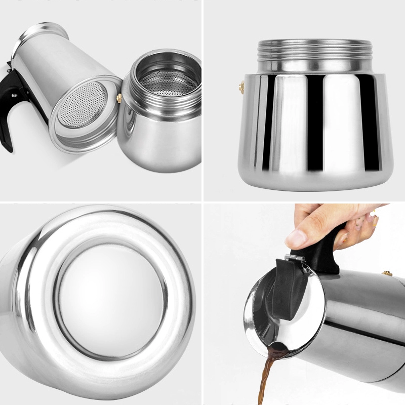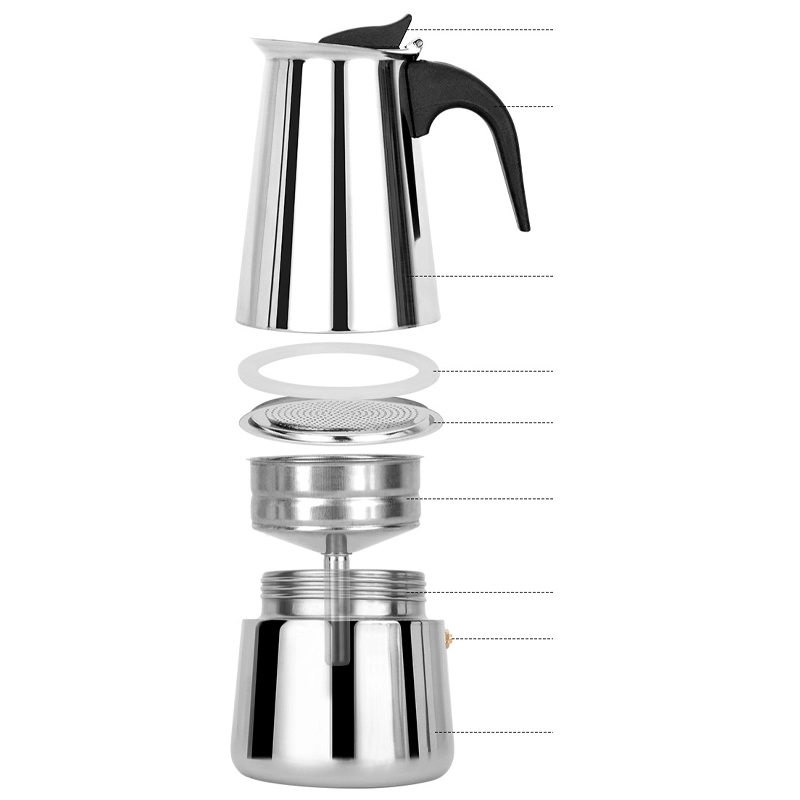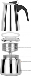 Az akár 12 csésze kapacitás praktikus segítőtárssá teszi család és vendégek számára. A hőálló fogantyú megkönnyíti a kiöntést, a rozsdamentes acél pedig hosszú élettartamot és karcállóságot biztosít. A kávéfőző gáz- és elektromos tűzhelyen is használható, és a készítés után könnyen szétszedhető és tisztítható.