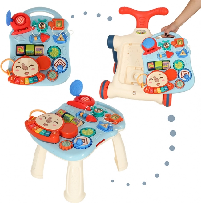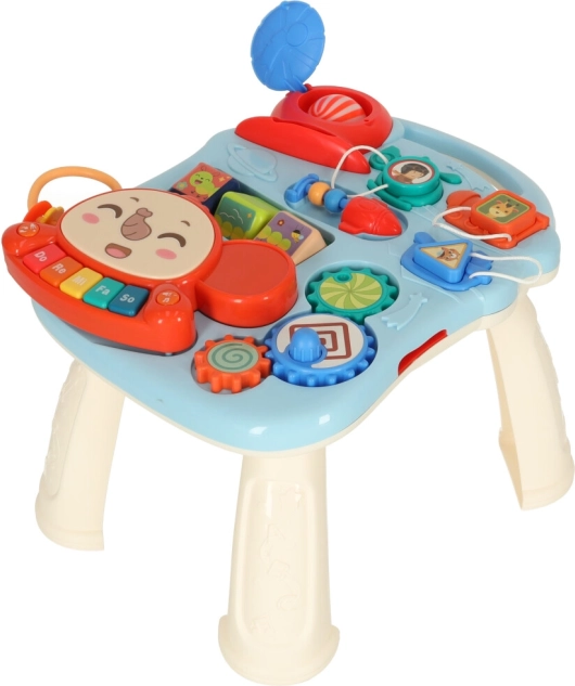 A tábla és az asztal interaktív elemeket kínálnak, amelyek támogatják a gyermek érzékszervi képességeit és kíváncsiságát.