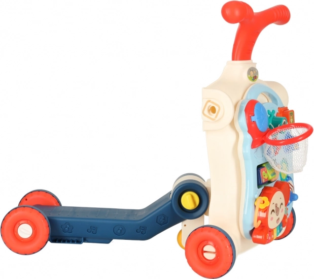 A termék tartós műanyagból készült, és különféle interaktív elemeket tartalmaz, mint például zongora, műanyag fogaskerekek, kockák és kosár labdák számára, amelyek támogatják a gyermek kognitív képességeinek fejlődését.