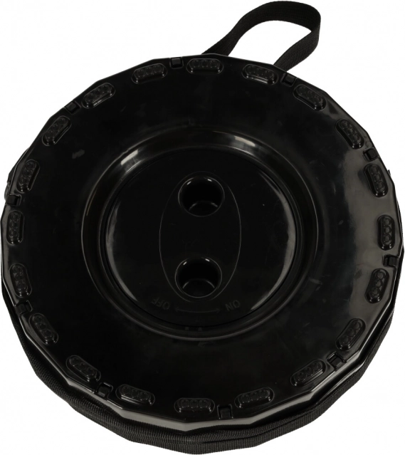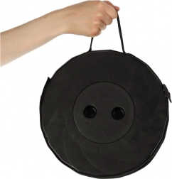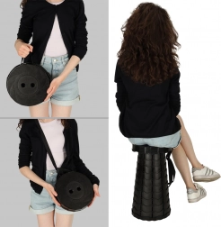 Összecsukva a szék lapos tárcsa alakú. A pántnak és a fogantyúnak köszönhetően kézben vagy vállon is vihető, és helyet takarít meg a hátizsákban.