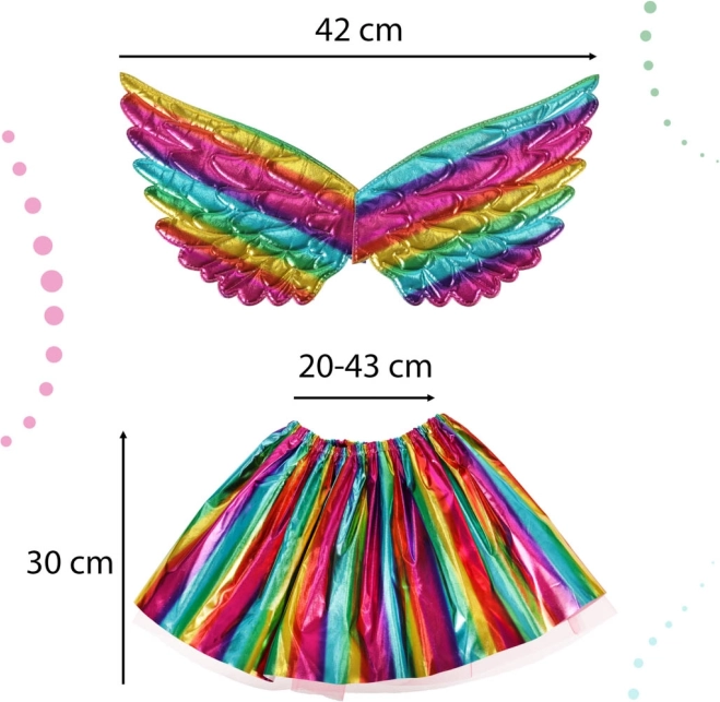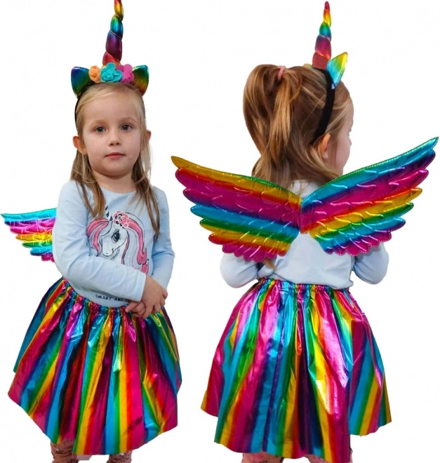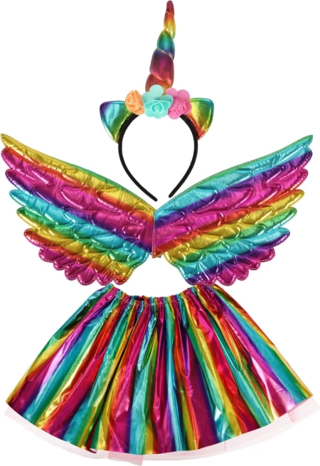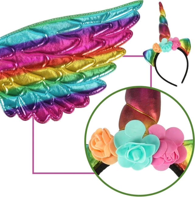 A csomagban mindent megtalál, ami szükséges - szivárvány szárnyak, szarvas fejpánt és szoknya, ideális bármilyen ünnepségre.
