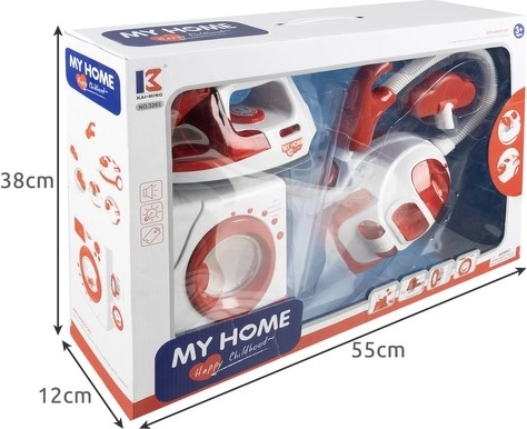 A gyermek háztartási készülékszett valódi készülékek utánzatát kínálja, beleértve a mosógépet, vasalót és porszívót. Remek szórakozás a gyermekeknek, miközben házimunkákra játszanak.