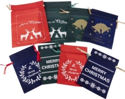 Fedezd fel az ajándékok csomagolásának egyszerű és stílusos módját. Ezek a nemszőtt textilből készült karácsonyi ajándéktasakok strapabírók, könnyűek és többször használhatók, így kiválóan illeszkednek a zero waste szemlélethez. Az elülső oldalt rénszarvas-, csengő-, magyal- és csillag motívumok díszítik fehér vagy arany színben.