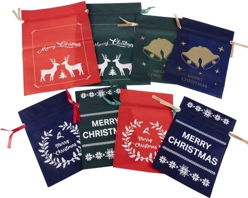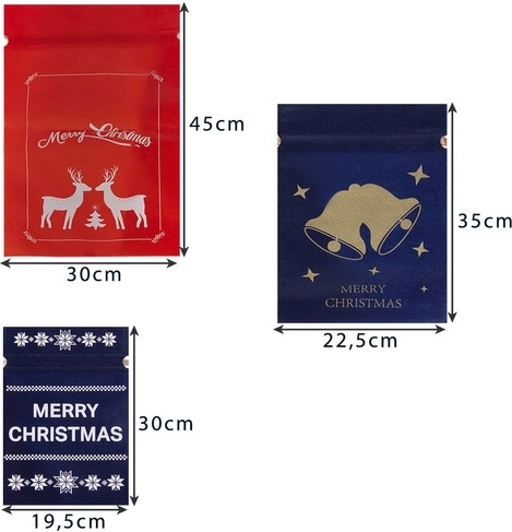 Elegáns, tartós nemszőtt textilből készült karácsonyi ajándékzsákok piros, zöld és sötétkék színekben. Könnyedén becsomagolhatod az ajándékokat olló és ragasztószalag nélkül, minden tasakon ünnepi motívum és „Merry Christmas” felirat található. Három praktikus méret apróságokhoz és nagyobb csomagokhoz, többször használható és stílusos kivitel a szép, hulladékmentes karácsonyért.