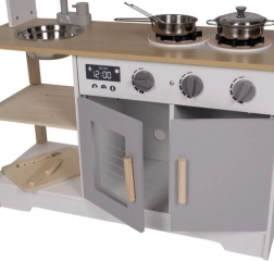 Tartozékok kis szakácsoknak - a készlethez adunk: lábas, serpenyő és fedő, vágódeszka, 2 tányér, kés, merőkanál, spatula, só, bors, mustár, ketchup. A tálca a tűzhelyben kivehető, a gyerek/szülő játék után vízzel megtöltheti, és elmoshatja a „piszkos” edényeket.