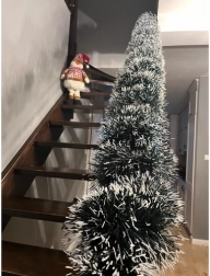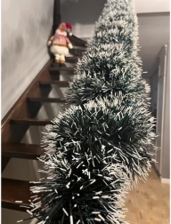 Zöld tűlevelek fehér végződésekkel természetes „fagyos” hatást keltenek, mintha frissen hullott hó borítaná, és szépen érvényesülnek a fán és a korláton is.