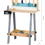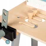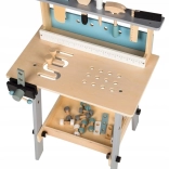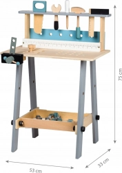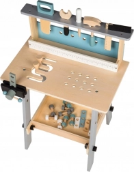 A csomag része a praktikus satu, lyukakkal és mércével ellátott munkalap, valamint polc a szerszámok tárolásához. A természetes fa tompított színekkel minden gyerekszobában stílusosan mutat, és támogatja a kreatív és szerepjátékot.
