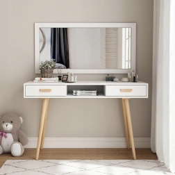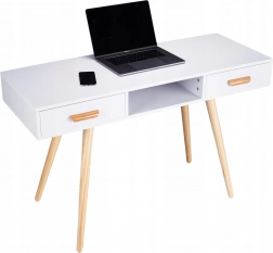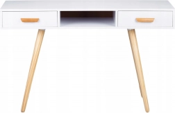 A laminált lap karcolás- és elszíneződésálló, amit a mindennapi használat során különösen értékelni fog. A tömör fenyő lábak szilárdságot és stabilitást adnak, nem billegnek. A két tágas fiók és a középső nyitott fülke elnyeli a kozmetikumokat, irodaszereket és apró kiegészítőket.