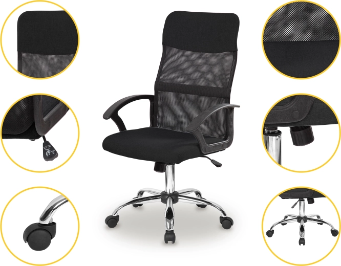 A szék öt gumírozott görgővel van felszerelve, amelyek könnyű és biztonságos mozgást tesznek lehetővé bármilyen felületen a sérülés kockázata nélkül. Modern dizájnja és elegáns fekete színe révén tökéletesen illeszkedik bármely irodai környezetbe.