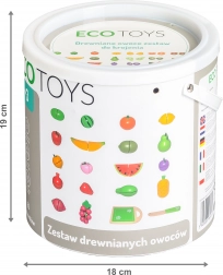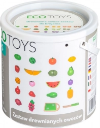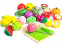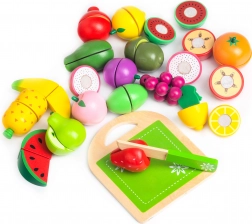 A fa gyümölcskészlet környezetbarát anyagokból készült és gyermekbarát festékkel van bevonva. Tartalmaz egy fa deszkát és kést a szeleteléshez, lehetővé téve a gyerekek számára a valós konyhai tevékenységek szimulálását. A gyümölcsök tépőzárral kapcsolódnak össze, ami finom ellenállást nyújt szeleteléskor, és valósághű hangot ad, mint a valódi gyümölcsöknél.