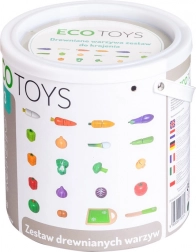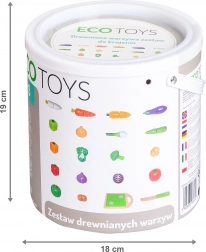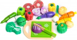 A készlet remek kiegészítő azoknak a gyerekeknek, akik játék konyhával, standdal vagy bolttal játszanak. Ezekkel a fa termékekkel a játék még kreatívabb lesz, és biztosan sok örömet szerez. Minden elem fából készült, és gyermekbarát festékkel van bevonva. A zöldségek két félből állnak, amelyeket tépőzár köt össze, így a gyerekek láthatják, hogyan néznek ki felvágva. A csomag tartalmaz egy fa vágódeszkát és kést is.
