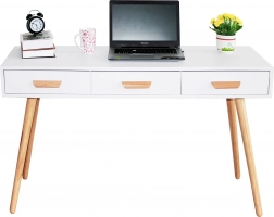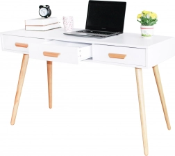 Élvezze az asztal modern megjelenését, amely ötvözi a fehér felső lapot a fenyőfa elemekkel. Érdekes forma és gondos kivitelezés biztosítja a vonzó megjelenést minden belső térben. Az asztal szolgálhat sminkasztalként a hálószobában, jól megtervezett íróasztalként az irodában vagy konzolasztalként a nappaliban.