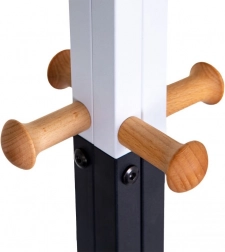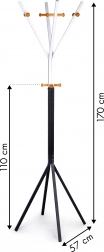 Elegáns álló ruhafogas fekete-fehér kivitelben, természetes fa szegecsekkel, amely illik a modern enteriőrökhöz. A stabil, háromlábú talpnak köszönhetően nagyobb terhelés mellett is masszív marad, a műanyag végzárók pedig védik a padlót. A fém szerkezet porszórt bevonata kopásálló és könnyen tisztítható.