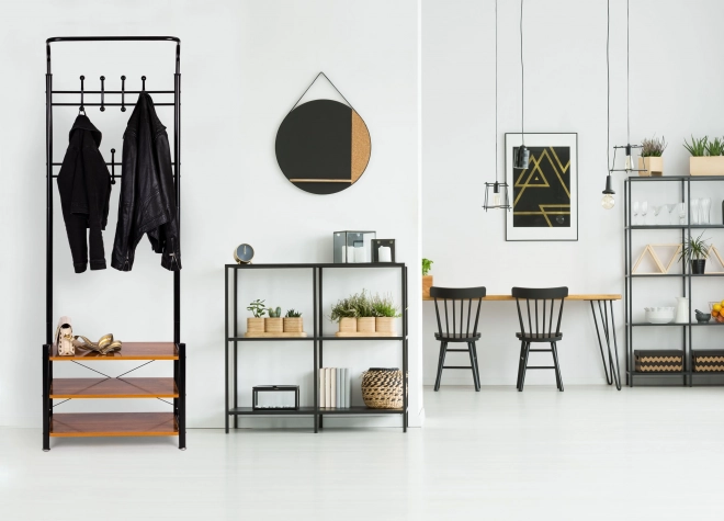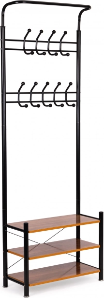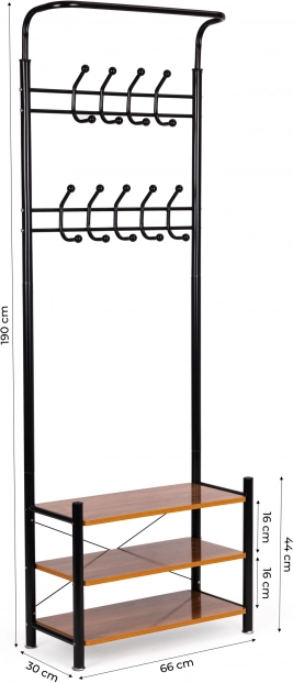 A felső rész két sorban összesen 18 akasztóval rendelkezik, ami ideálissá teszi az állófogast otthoni gardróbokba, irodákba vagy várókba. Az alsó rész három praktikus polcot tartalmaz kis tárgyak, táskák vagy cipők számára. A stabilitást a négy lábú fém alap biztosítja.