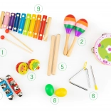 A készlet népszerű ütőhangszereket tartalmaz – tamburin, triangulum, maracas és cintányér – amelyek segítik a szem-kéz koordinációt, a koncentrációt és a kreativitást. A biztonságos kivitel éles élek nélkül és a tartós anyagok hosszú élettartamot biztosítanak.