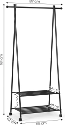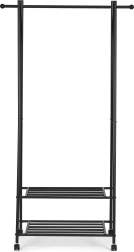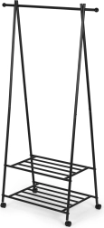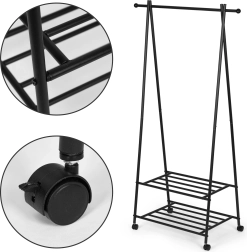 Az 77 cm hosszú felső rúd dzsekik és ingek felakasztására van kialakítva, míg az oldalsó kampók ideálisak táskák, hátizsákok vagy sálak és sapkák számára. A tartó alsó részei két funkcionális polccal vannak felszerelve kisebb ruhák vagy cipők számára. A fém szerkezet stabilitást biztosít nagy terhelés esetén is.