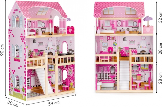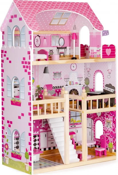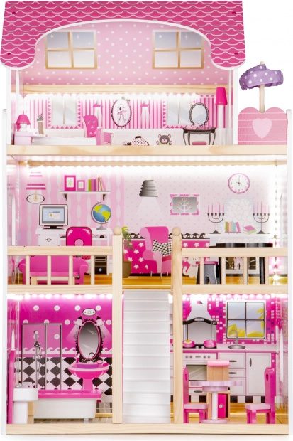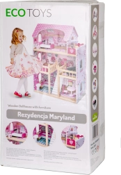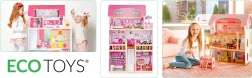 Az ECOTOYS babaház kreatív játékra és a gyerekek fantáziájának fejlesztésére készült. Három önálló szintből áll, összesen öt helyiséggel, amelyek tökéletesen utánozzák egy valódi ház elrendezését. Minden szoba bútorokkal és dekorációkkal van felszerelve, melyek a gyermek elképzelései szerint könnyen átrendezhetők.