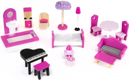 A készlet 17 darab fa bútort tartalmaz, például asztalt székekkel, kanapét, dohányzóasztalt, sütőt nyitható ajtóval, kádat, WC-t, mosdót tükörrel, zongorát paddal, ágyat, éjjeliszekrényt és puffot, valamint három állólámpát, ami végtelen játékszcenáriókat tesz lehetővé.