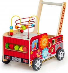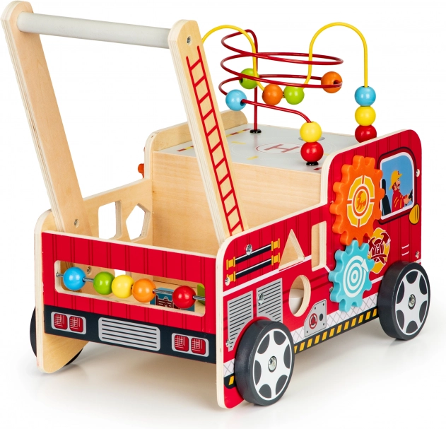 A tűzoltóautó formájú fa járóka ideális első lépések segítője a gyermekének. A járóka úgy lett tervezve, hogy stabilitást biztosítson, és ugyanakkor szórakoztasson az interaktív elemek, mint például a fogaskerekek, gyöngylabirintusok és formaválogatók révén.