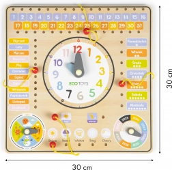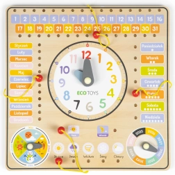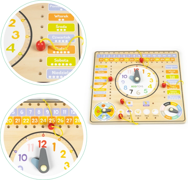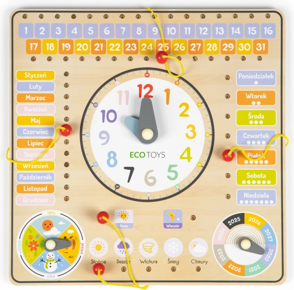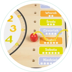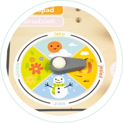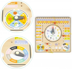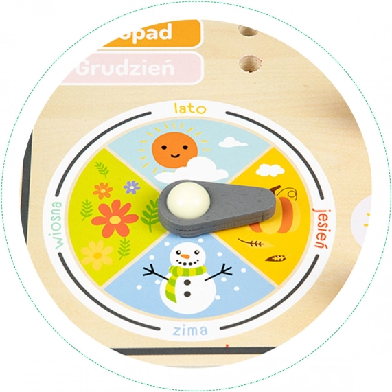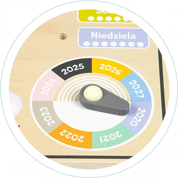 A tábla lengyel neveket tartalmaz, de a könnyen érthető és tartós fa szerkezete miatt ideális cseh gyerekek számára is. Lehetővé teszi a gyerekek számára, hogy jobban megértsék az évszakok sokféleségét egy forgó mutató segítségével. A táblán jelölhető az év 2020 és 2027 között.