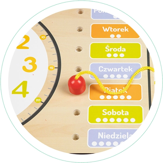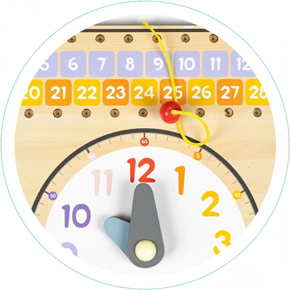 Engedje meg gyermekeinek, hogy felfedezzék a világot ezzel a színes és biztonságos fatáblával. Megtanítja a gyerekeket felismerni a hét napjait, a napok és hónapok sorrendjét. Speciális mezők segítségével a gyerekek fonallal és facsipeszekkel jelölhetik meg a naptár napjait.