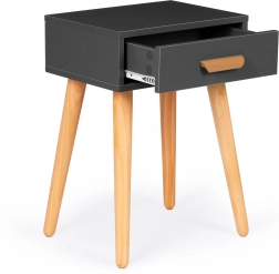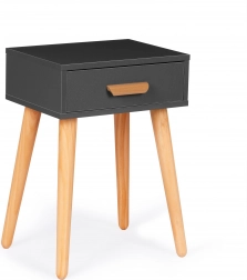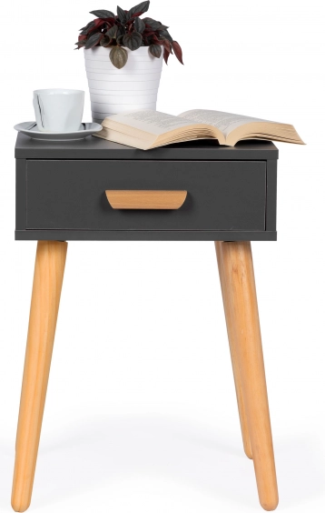 Letisztult elegancia minimalista kivitelben. Ez a sokoldalú asztal szolgálhat éjjeliszekrényként az ágy mellett, illetve lerakó-/dohányzóasztalként a kanapé mellett. A praktikus fa fogantyús fiók mindent elrejt, amire szükség lehet, míg a kompakt méretek helyet spórolnak és megőrzik a belső tér rendezett megjelenését.
