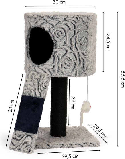Minden platformot puha plüss borít, így kiváló pihenő- és kényelmes helyet biztosít. Három lógó pompon is tartozik hozzá, amelyek ösztönzik a játékot és szórakoztatják kedvencedet. A stabil szerkezetnek köszönhetően a kaparó masszív és biztonságos, ami fontos a játék közbeni stabilitás szempontjából.
