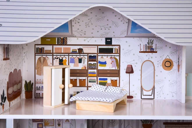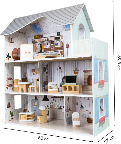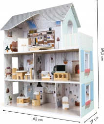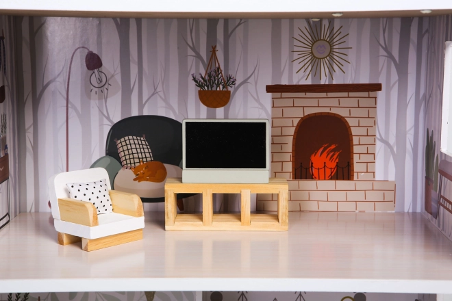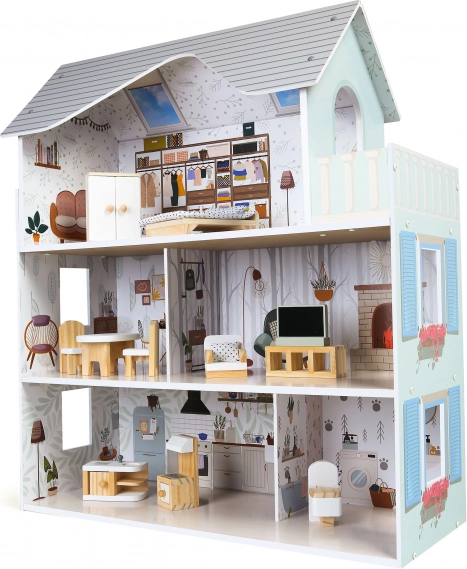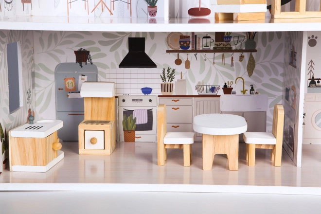 A ház három különálló szinttel és összesen négy szobával rendelkezik, amelyek különböző funkciók szerint vannak berendezve. A csomag tartalmaz 10 fából készült bútordarabot és különféle kiegészítőket, mint például porszívó, gitár, tükör vagy kutyaház. Minden elem szabadon mozgatható és átrendezhető.