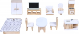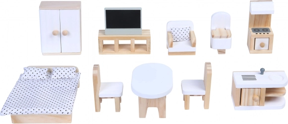 A készlet színes fa elemeket tartalmaz, mint szekrény, TV-állvány, karosszék, WC, tűzhely, ágy, asztal és két szék, konyhapult és további alkotórészek, amelyek a házat valóságos otthonná varázsolják.