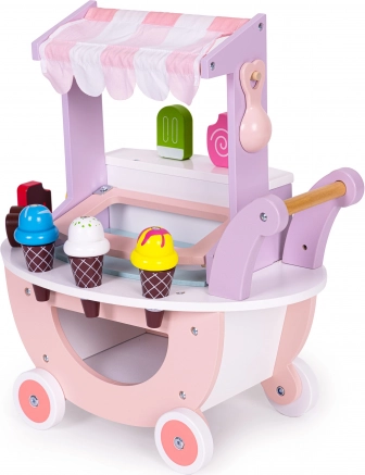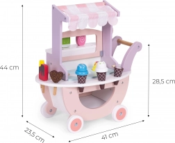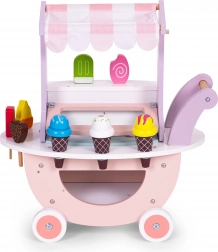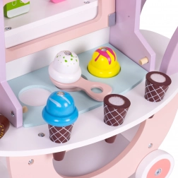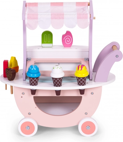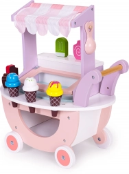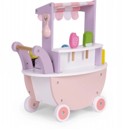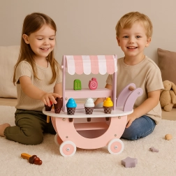 Ajándékozzon órákig tartó kreatív szórakozást az ECOTOYS fagylaltos standjával. A guruló kocsi tetővel és a gazdag kiegészítőknek köszönhetően a gyerekek könnyen belebújnak az eladó és a vásárló szerepébe. A fa kivitel, a lekerekített élek és a lágy színek nyugodt és biztonságos játékot támogatnak.