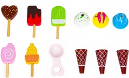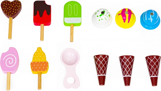 Okos mágnesek kapcsolják össze a gombócokat a tölcsérrel és a kanállal, így a mertés és a tálalás élethű élményt nyújt. A készlet változatos pálcikás fagyikat és tölcsérbe való gombócokat tartalmaz, amelyeket a gyerekek ízlésük szerint kombinálhatnak.