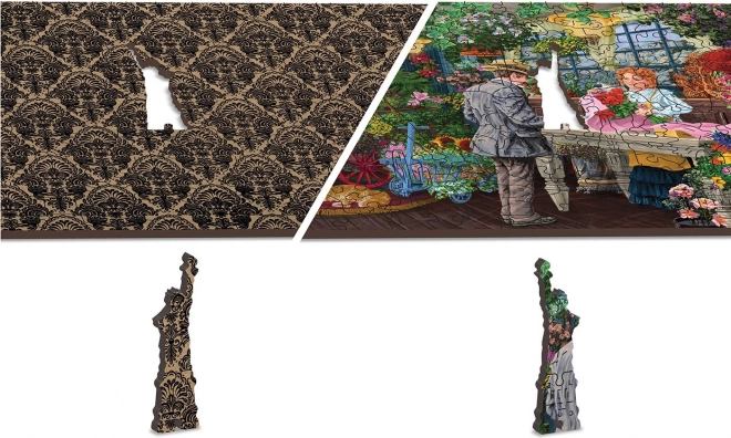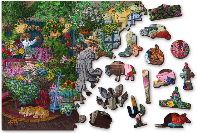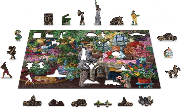 Stílusos fa kirakó az élettel teli virágbolt motívummal, amely elnyeri a részletgazdag illusztrációk és az igényesebb kirakók kedvelőinek tetszését. A kétoldalas kivitelnek köszönhetően két kirakót élvezhet egyben – az előlapon színes jelenet virágokkal, a hátoldalon minta a formák szerinti kirakáshoz. Az egyedi kivágások állatok, alakok és tárgyak formájában apró figurákként működnek, új dimenziót adva az élménynek.