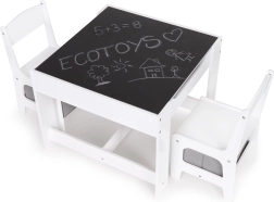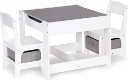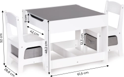 Gyönyörű készlet minden gyermek számára, amely egyszerű formájának köszönhetően tökéletesen illeszkedik a gyerekszobák, játszószobák vagy várók decorjába. A szett MDF-ből készült, ezért ellenálló a sérülésekkel/karcolásokkal szemben. A készletet két stabil és kényelmes szék egészíti ki funkcionális kosarakkal az ülőrész alatt, amelyek ideálisak a játékok tárolására.