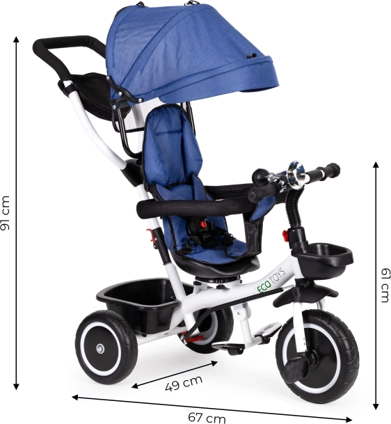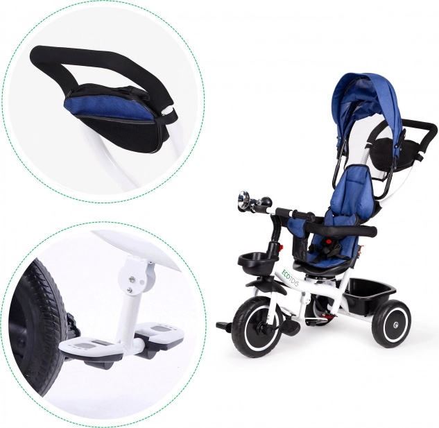 Az ECOTOYS tricikli ideális választás a biztonságos és kényelmes jármű kereső szülők számára gyermekeik számára. 360°-ban forgatható ülés lehetővé teszi a gyermek ültetési irányának szükség szerinti beállítását. A puha háttámla és az öt pontos biztonsági övek maximális biztonságot és kényelmet biztosítanak a gyermek számára.