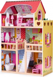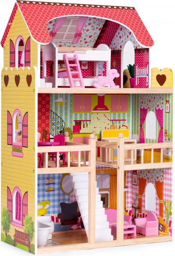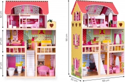 Az egész babaház minőségi fából készült, ami azt jelenti, hogy a játék hosszú évekig szolgál. A földszinten fürdőszoba és nappali található kanapéval a babának. Az első két szintet fehér, fából készült lépcső köti össze. A második emelet konyhával és étkezővel, valamint fa korláttal van felszerelve, amely megakadályozza, hogy a baba leessen. A legfelső szinten hálószoba található a babának, teraszra nyíló kijárattal.