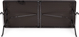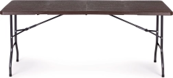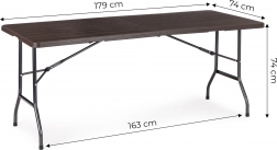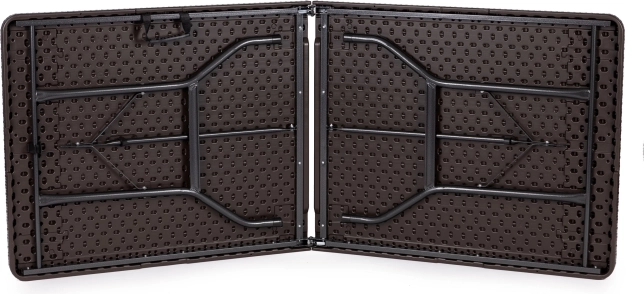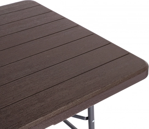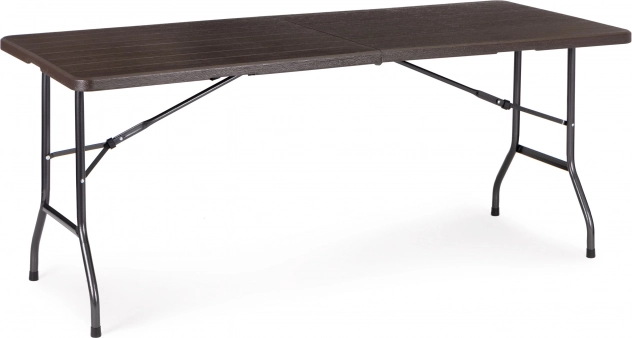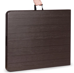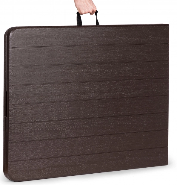 Praktikus, összecsukható catering asztal 180 × 74 cm-es méretben barna famintázattal, ideális ünnepségekhez, rendezvényekhez és kerti használatra. Stabil acél vázat, 4 cm vastag, strapabíró HDPE asztallapot és gyors, fogantyús bőröndméretre csukható rendszert kínál. A csúszásgátló talpvégeknek és akár 100 kg teherbírásnak köszönhetően beltéren és kültéren egyaránt használható, valamint 100%-ban vízálló.