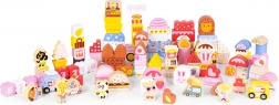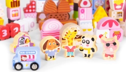 Alkossanak édes várost tele fagyizóknál, cukrászdákkal és bájos részletekkel. A színes fa kockákon ételek, számok és betűk mintái segítik a játékos tanulást – építés közben a gyerekek természetesen gyakorolják a formák, színek és szimbólumok felismerését.