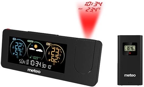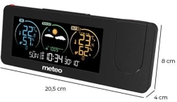 A METEO digitális meteorológiai állomás átfogó megoldást kínál a beltéri és kültéri hőmérséklet és páratartalom mérésére. Projektorral van felszerelve, amely kulcsfontosságú információkat, például időt és hőmérsékletet vetít ki a választott felületre a szobában.