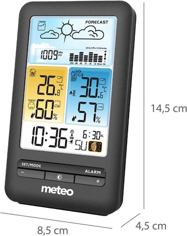 A modern METEO otthoni meteorológiai állomás színes kijelzővel vezeték nélküli hőmérséklet- és páratartalom‑mérést kínál beltéren és kültéren, barométert nyomásgrafikonnal, időjárás‑előrejelzést piktogramokkal, DCF rádióvezérelt órát és ébresztőt, valamint Holdfázis‑kijelzést. A legfeljebb 60 m hatótávú külső szenzor megbízható adatátvitelt és kényelmes áttekintést biztosít otthona klímájáról.