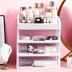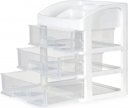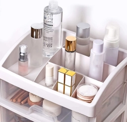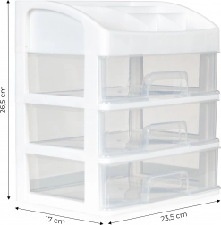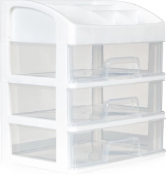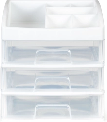 Tartsd a kozmetikumaid szervezetten és átláthatóan stílusos fehér műanyag rendezőnkkel. Praktikus kialakítása több rekeszt és három átlátszó fiókot kínál, amelyekben könnyen tárolhatók különböző apróságok.