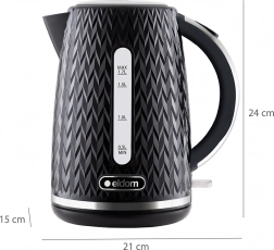 Az ELDOM C260 Nelo vízforraló elegáns fekete megjelenést ötvöz a mindennapi kényelmet szolgáló funkciókkal. A 2000 W teljesítménynek köszönhetően villámgyorsan felforralja a vizet, míg a vízszintjelző a 0,5 l-től kezdődő egyszerű utántöltést tesz lehetővé. A kezelése intuitív – a fedelet a fogantyúnál lévő gombbal nyithatja, a LED-del megvilágított kapcsoló pedig egyértelműen jelzi a működést.